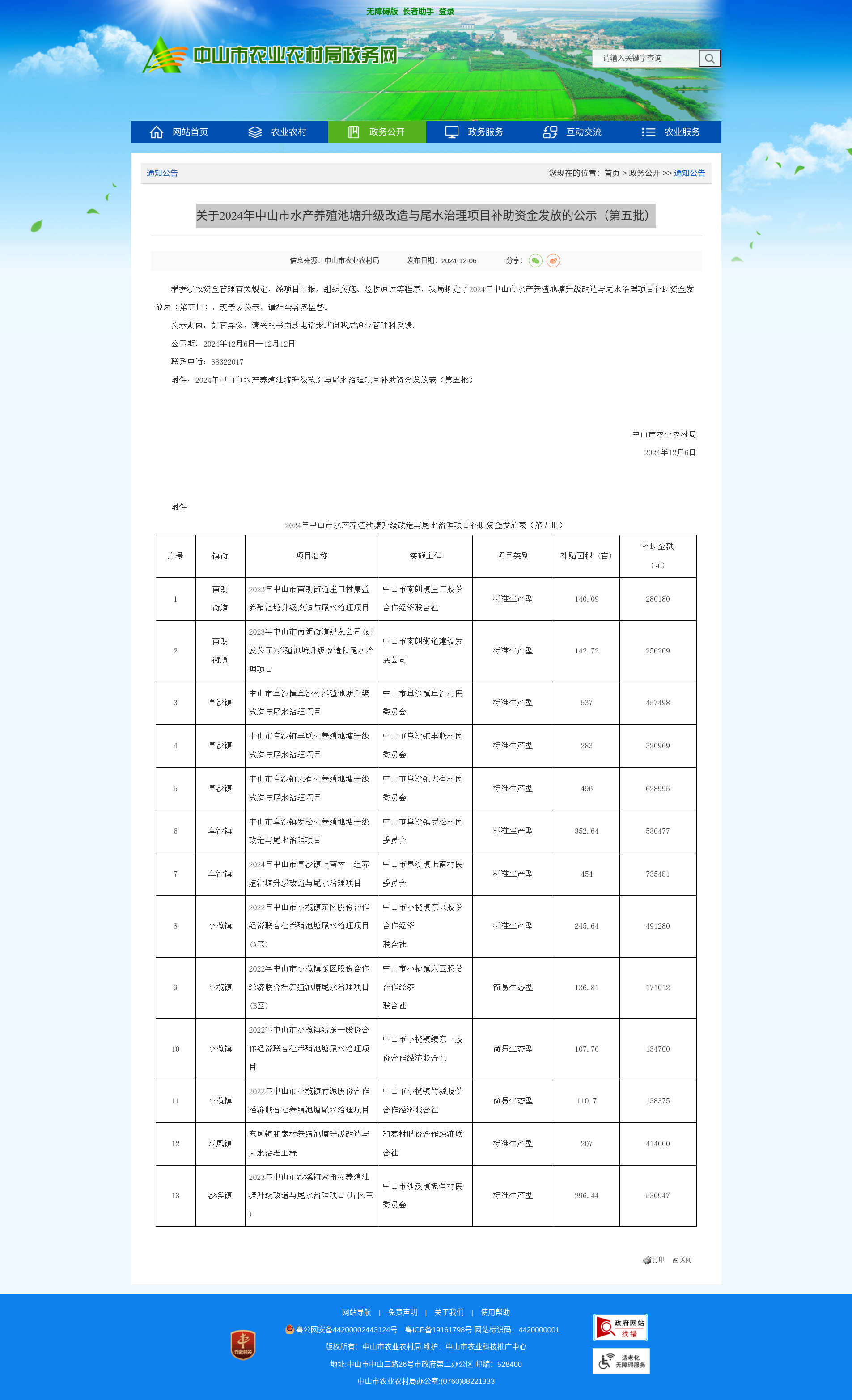 目前,小榄镇、阜沙镇、东凤镇养殖池塘升级改造与尾水治理项目已通过市级复验及公示,为做好项目资金的结算工作,现将有关事项函告如下: